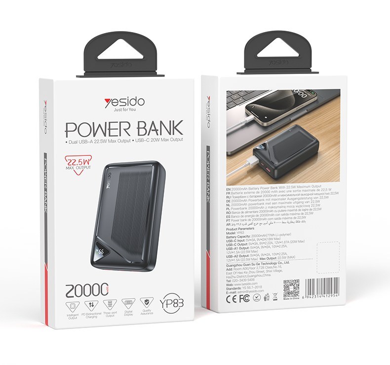 پاوربانک 22.5 وات یسیدو مدل YP83 ظرفیت 20000 میلی آمپر ساعت