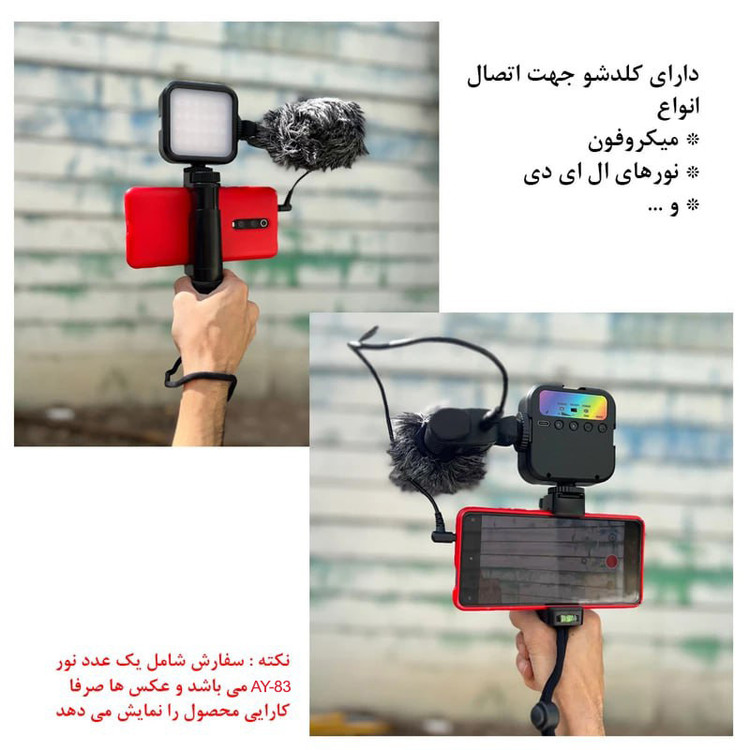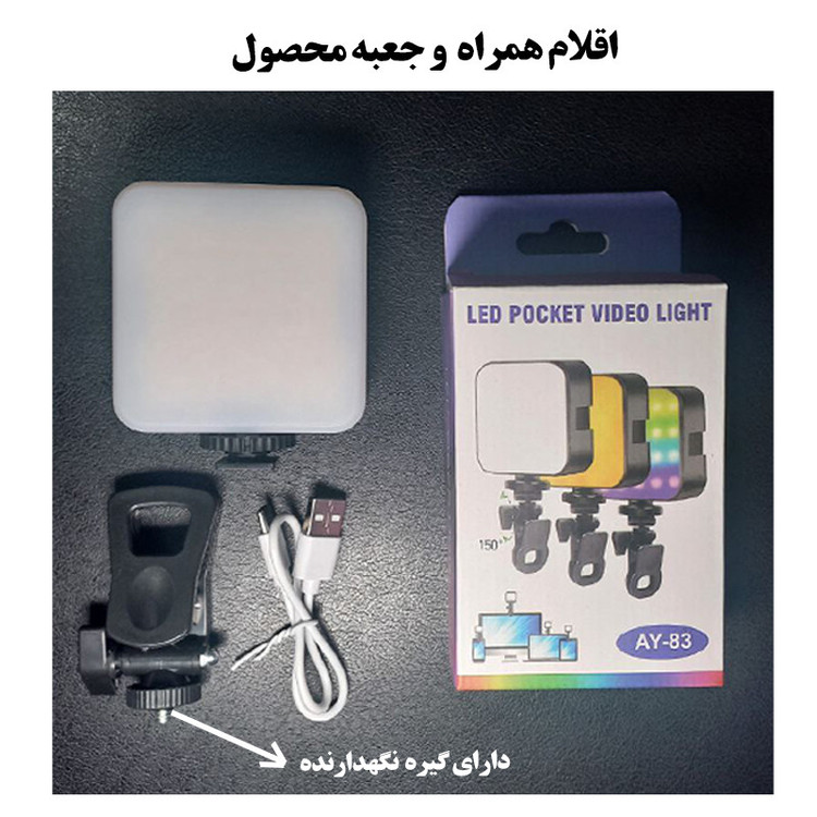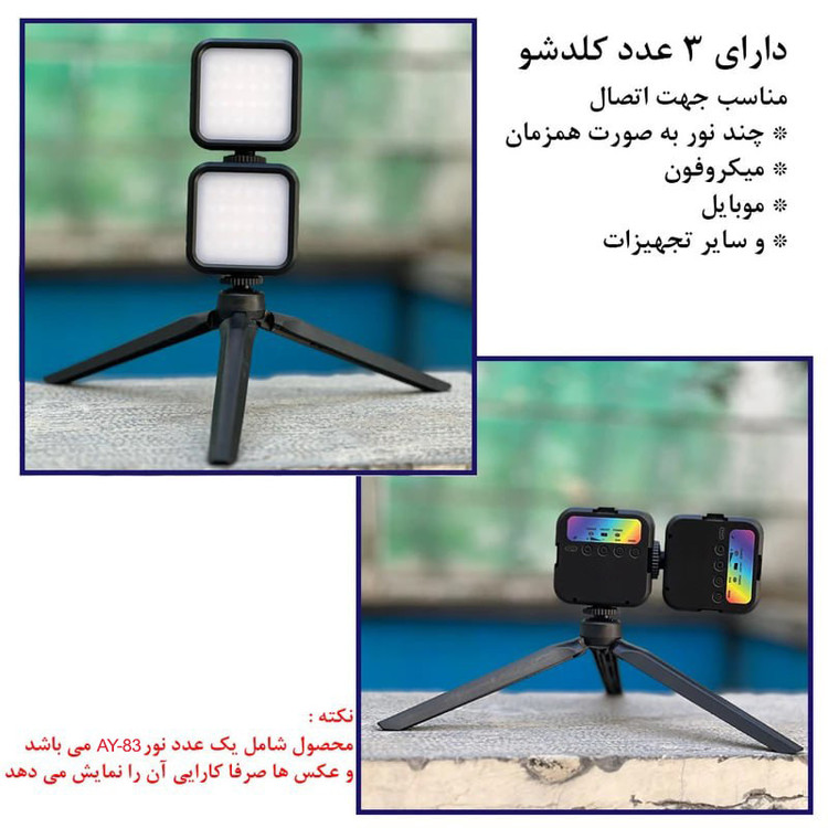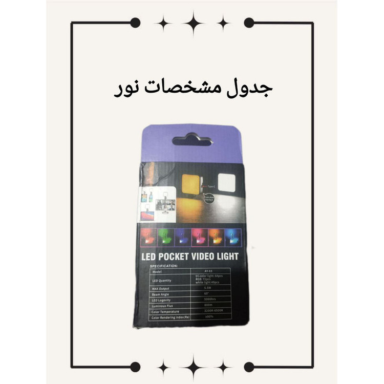 نور ثابت ال ای دی مدل AY-83 یک انتخاب ایدهآل برای عکاسان، ولاگرها و تولیدکنندگان محتوای حرفهای است. این نور کوچک و قابل حمل با ۱۸۵ چراغ LED در سه رنگ مختلف، روشنایی قدرتمند و افکتهای نوری متنوع را در اختیار شما قرار میدهد. قابلیت تنظیم دمای رنگ بین ۳۲۰۰ تا ۶۵۰۰ کلوین و شدت نور، باعث میشود بتوانید آن را با شرایط نوری محیطی هماهنگ کنید. این نور همچنین دارای باتری داخلی قابل شارژ و قابلیت نصب روی سهپایه یا دوربین است.